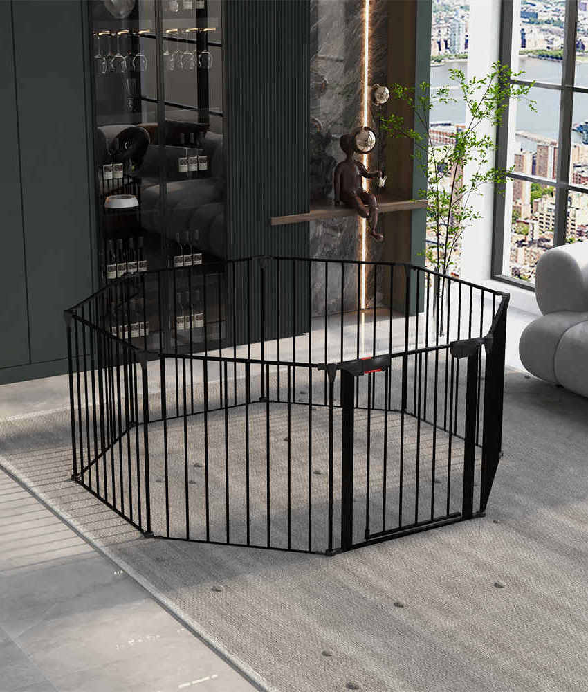 1. Pet Gate – It can be used as a freestanding pet gate when you set it up as a circular enclosure; 2. Safety Fence – Suitable to use around fireplaces, grills, wood burning stoves, Christmas tree, etc.3. Play yard: Set up sectioned off areas in your home for your toddlers or pets; 4. Barrier: Solid construction make this a great option for creating room dividers; 5. Baby Gate – Great for wide spaces, angled openings, hallway, doorway or bottom of stairs