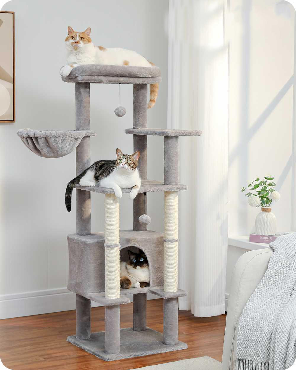Equipped with a roomy condo, large plush top perch, spacious hammock, natural sisal-covered scratching posts and removable fluffy dangling ball, this 55’’ cat tree is perfect for entertaining and taking a good rest.
