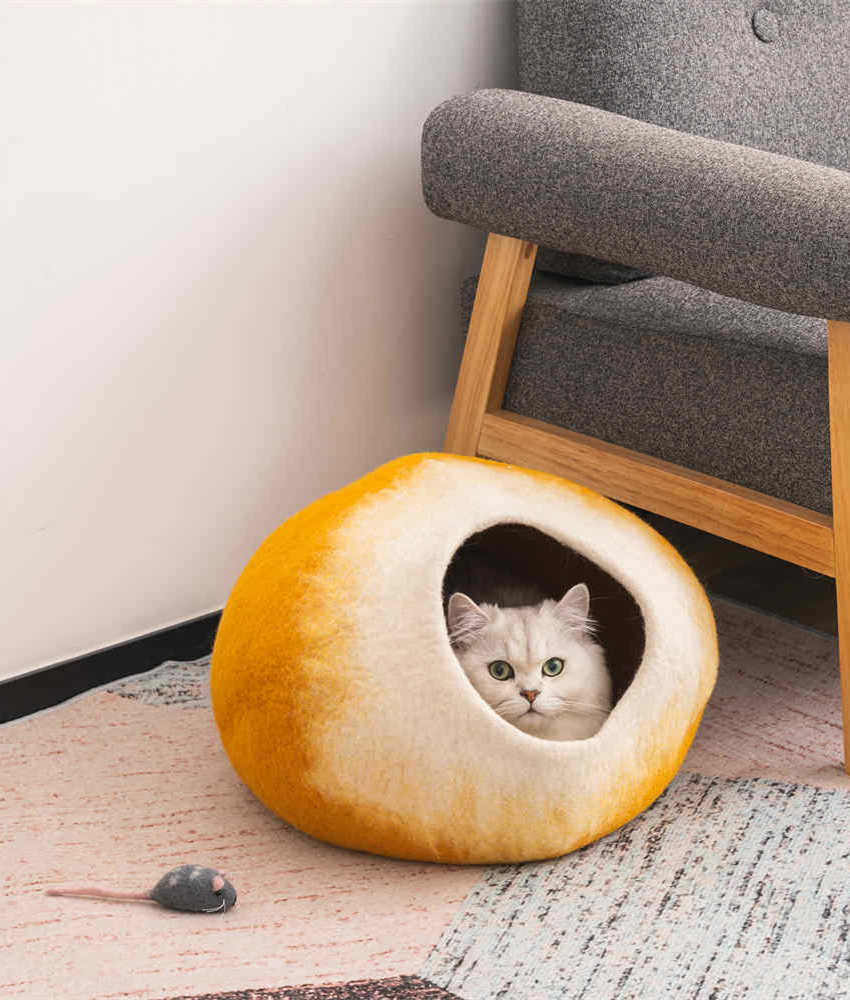Our felted wool cat cave provides a private personal space for your cat to hide, sleep and rest inside.