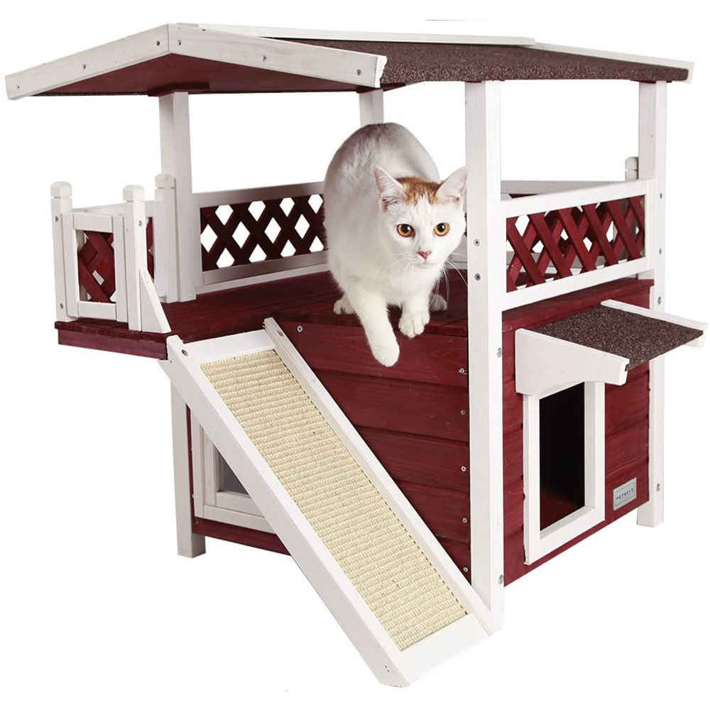 This two-story outdoor weatherproof cat house is design with a spacious 30 inches long x 22 inches wide x 29 inches high.