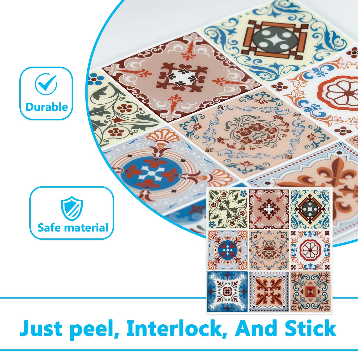 Transform any room with these stunning Moroccan-style tile stickers! Each set includes 10 easy-to-apply tiles (12″ x 12″), covering 10 sq. ft. for instant elegance. Perfect for walls, floors, or furniture—peel, stick, and enjoy a bold, personalized upgrade. Elevate your space effortlessly with this durable, peel-and-stick decor.