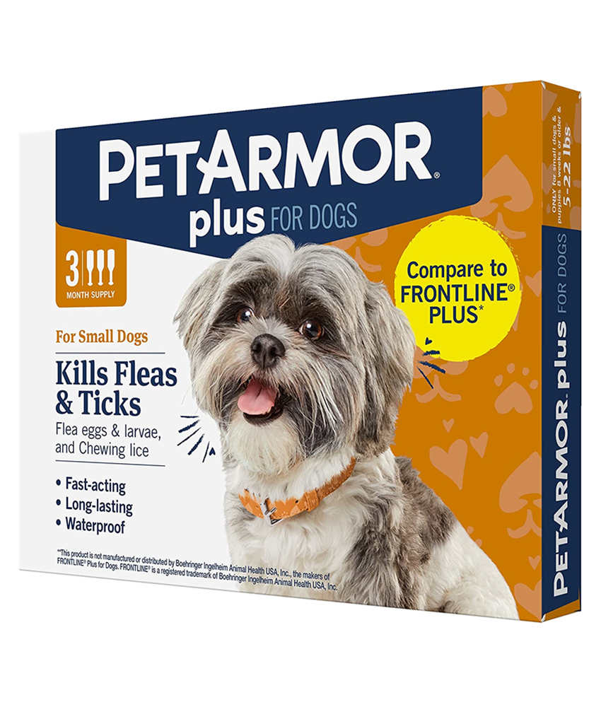 Your pets are family, and PETARMOR helps you confidently care for your dog, especially when it comes to flea and tick control. PETARMOR plus conveniently provides vet-quality protection without the expense of a vet visit. PetArmor Plus Flea and Tick Topical For Small Dogs 5-22 lbs., 12 weeks and older is a waterproof, fast-acting, long-lasting formula that kills adult fleas and ticks plus stops the flea cycle dead in its tracks. This dog flea treatment has the same active ingredients as FRONTLINE® Plus for Dogs. Get nose to tail 30-day protection with each dose at an affordable price. One three-dose package of PetArmor Plus Dog Tick and Flea Treatment offers three (3) months of continuous coverage for all breeds.