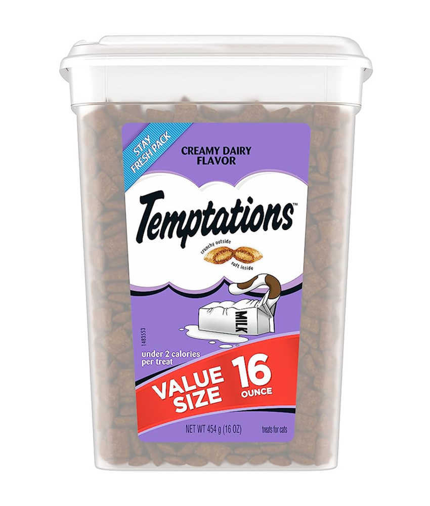 Cats can’t resist the delectable taste of TEMPTATIONS, so give your cat these purrfect TEMPTATIONS Classic Cat Treats… they’ll come running the moment you open the tub. Each of these low calorie creamy dairy flavor cat snacks has less than 2 calories and provides an irresistible combination of both crunchy and soft textures. These healthy cat treats also come in a cat-proof, stay-fresh tub, so your feline friend can enjoy their favorite snack when you open it, but never when they shouldn’t! These TEMPTATIONS Classic Cat Treats are a perfect addition to your cat’s normal feeding routine: Use them as a treat, a meal, or a cat food topper. They also are the perfect size treats for cat toys… try mixing up playtime by placing a few inside a treat dispensing toy and watch your cat chase and swat away. * Based on 2020 Nielsen sales data