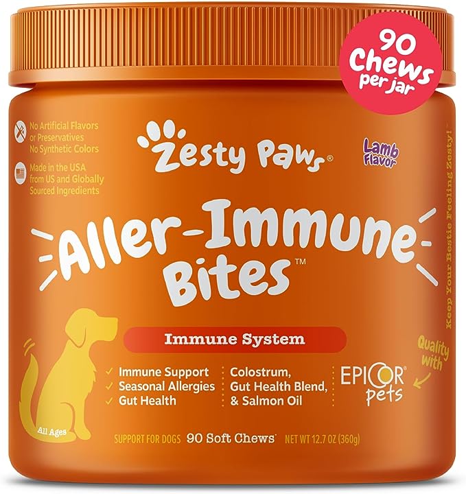 If sensitive skin or seasonal allergies give your dog a hard time, Zesty Paws Aller-Immune Bites chewables are the most pawsome functional supplements to support your furry fave.